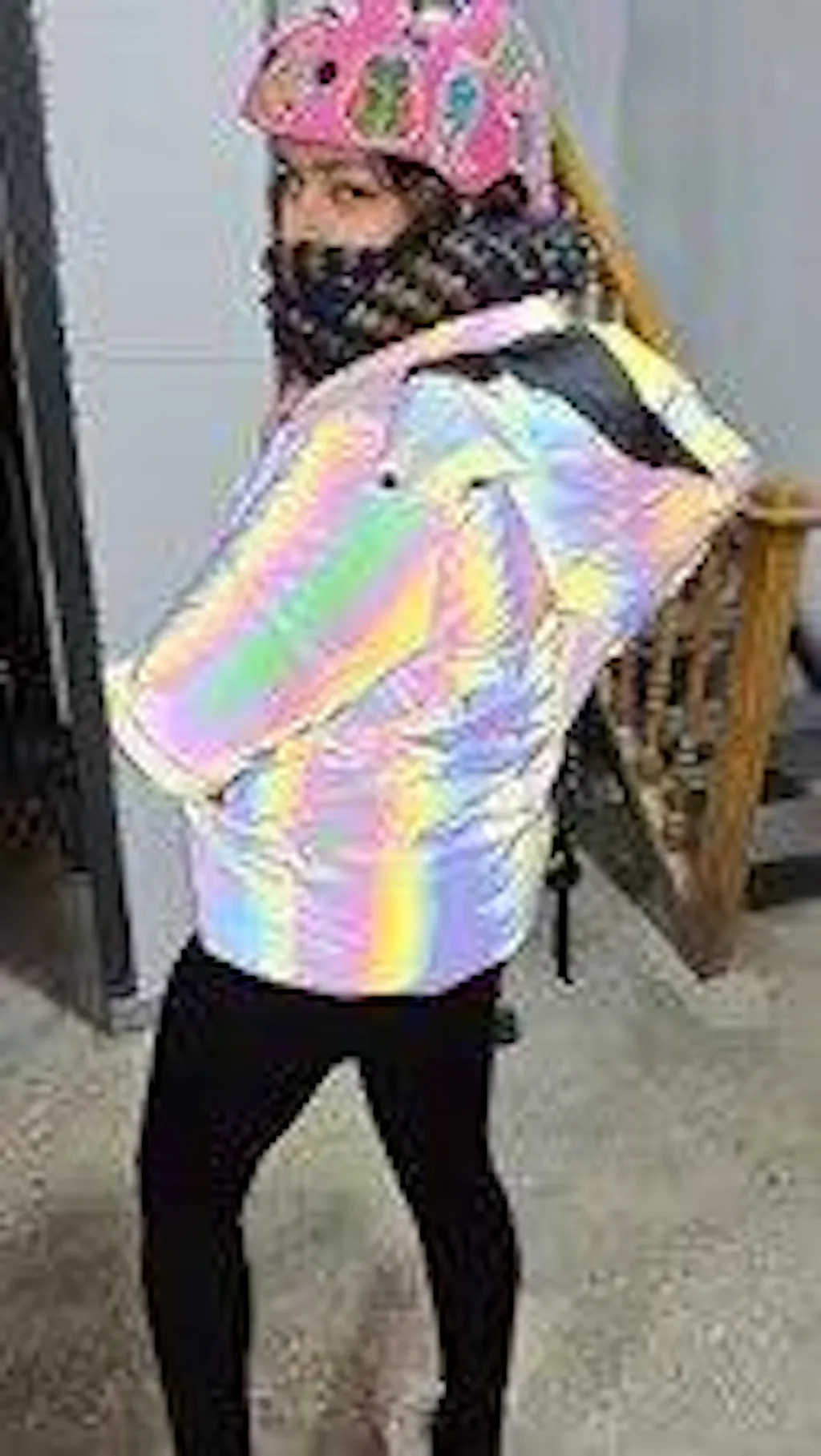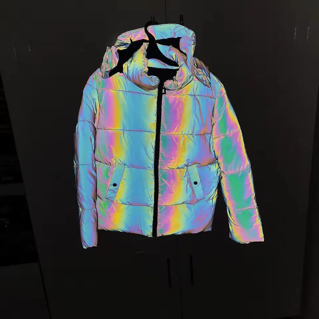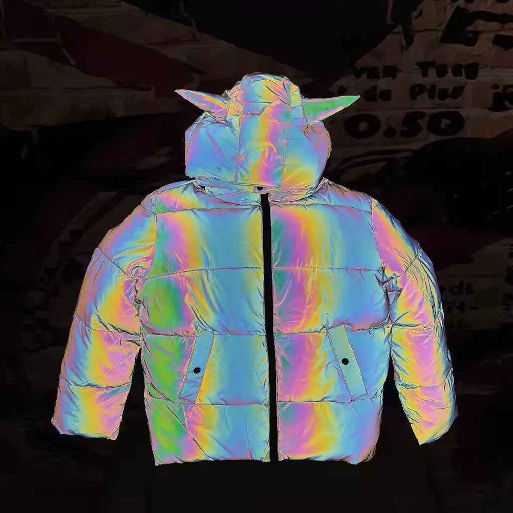 Turn heads the moment you step out. This statement puffer brings high-energy shine with a futuristic edge, finished in a bold reflective shell that reacts to light from every angle. Cropped at the waist with an oversized hood and signature horn detail, this piece carries serious presence. Made for nights that run late and fits that speak loud, this jacket blends street attitude with standout texture. The glossy iridescent finish shifts as you move, giving your look instant impact whether layered over basics or worn as the centerpiece.